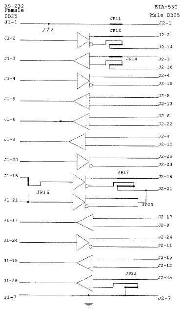 The phase of the signals associated with Pins 2, 3, 18, 21 and 25 are jumper selectable. There is a similarity between the RS-232 specification and the military specification MIL-STD-188C. The specifications differ in that the voltage range for the military specification is +/-6 V and the Model 62-1 / -2 drivers supply +/-10 V, although Telebyte receivers correctly decode inputs from military standard drivers. Secondly, MIL-STD-188C calls for wave shaping and the Model 62-1 / -2 has no wave shaping on the output signals. Finally, the specifications define the mark as a negative voltage whereas MIL-STD-188C define it as positive; jumpers have been provided on the data signals. To convert from RS-232 to MIL-STD-188C data signals, change jumper JP