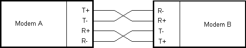 wires R+ and R- should be reversed. If DTR is on at one modem then DCD should be