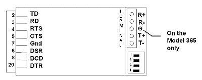 In addition to setting the five-position dip switch, the user must also determine if the Model 285/365 will be configured as a DCE or a DTE device. When configured as a DCE device, the Model 285/365 will connect to a DTE device such as a PC or terminal. When set as DTE device, it will connect to a DCE device such as a modem. The Model 365 has built-in protection to help prevent damage to the unit from surges. The surge suppression is connected internally to Frame Ground, Pin 1, and Signal Ground, Pin 7. This connection provides a path for the discharge of the surge. If the equipment does not support Frame Ground then the terminal marked "G" can be connected to an external earth ground connection. 4.0 OperationRS-422: When the Model 285/365 is configured as an RS-232 to RS-422 converter it will perform full-duplex conversion of the TD and RD signals. The RS-422 equipment is connected to the Model 285/365 through the five-position terminal block marked "G," "R-," "R+," "T-," and "T+." R+ and R- identify the receiver inputs into the unit and T+ and T- identify the transmitter outputs. When connecting the unit to other RS-422 equipment, the T+ and T- should be one twisted pair while R+ and R- should be another. The G connection is connected to Pin 1, Frame Ground, on the RS-232 port. RS-485: In the four-wire mode the Model