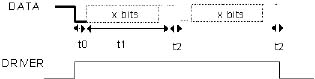 Detecting a start bit sets off the driver immediately ("t0"), remaining