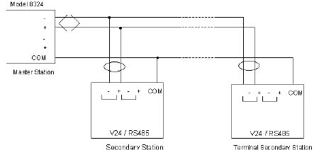 The intermediate secondary stations can use a balancing termination by connecting a "pull-up" resistor to the negative line side of the bus and a "pull-down" resistor to the positive side of the bus, thereby forcing a zero condition on the line. The secondary station transmission circuits present the characteristic of operating in three-state mode, a high impedance state during the idle period (i.e., period of non data transfer). The sending of data from one station can be initiated by the incoming RTS signal (Pin 4) on the RS-232 side going active, or by internal generation of a data-received signal on the RS-232 side. This second method, controlled by a microprocessor, enables the use of the Model 8324 with a simple three-wire (TD, RD and GND) RS-232 connection and XON/XOFF flow control. 2.3 RS-485 HDX operation modeThe lack of a control