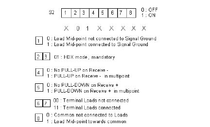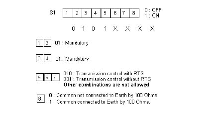 4.3 DIP-Switch S3Generally the use of an RS-485 interface implies controlling the half-duplex operation mode. The DIP-switch block S1 enables the selection of the operating mode and data transmission characteristics needed by the microprocessor when detecting and managing the active phases of the RS-485 transceiver (refer to section 2.3, "RS-485 HDX Operation Mode"). Transmitter Configuration S3-1 to S3-3 Baud Rate, S3-4 to S3-5 Byte Format |