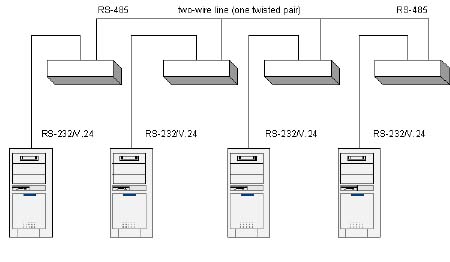 Note: The two-wire RS-485 link connecting the various equipment requires a cable with at least one twisted pair, nominal impedance of 120 W and general shielding. The use of a cable with different characteristics can lead to unreliable operation, especially in cases of high data rates and long distance.