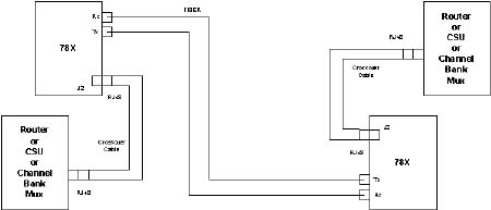 2.0 Operating ModesThis section describes the various operating modes of the Model 78X/278X Series Fiber-Optic Modems. Each unit is equipped with several switches that must be set properly to control the desired operation of the fiber-optic modem. These switches and their functions are described in this section. Typical Application Diagram The following figure illustrates a typical application for the Telebyte 78X/278X units. This is a short-haul application which implies the lengths of the crossover cables are less than 133 feet. All units are shipped with short-haul default settings (see diagram for details). Note: Please refer to