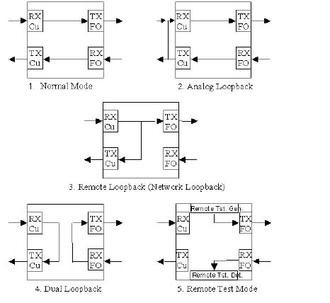 Normal Mode Data is passed from the copper RX side to the fiber TX side. Data from the fiber RX side is passed to the TX copper side. If enabled by S2, Network Loopback can be activated. Analog Loopback Data from the fiber RX side is transferred to the copper TX side, and is then routed to the copper RX side. Input data to the RX copper side is disabled. Remote Loopback (Network Loopback) Data from the copper RX side is transferred to the copper TX side, as well as to the fiber TX side. Input data from the fiber RX side is disabled. This mode may also be activated by a Network Loopback command if enabled by Switch S2.