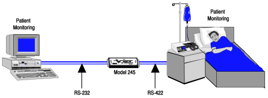 The Model 245 is an example of an Opto Isolated interface converter that is selectable to convert interfaces RS-422 or RS-485 to EIA-232. Another example of an optically isolated interface converter is the Model 287 EIA-232 to RS-422 Opto Isolated Interface Converter. This product is unique in the fact that it does not require and separate AC or DC power supply. It derives its power from the interface. We show how the Model 245 may be used in a typical hospital environment in Figure 3. The Model 245 and the Model 265 are Figure 4.